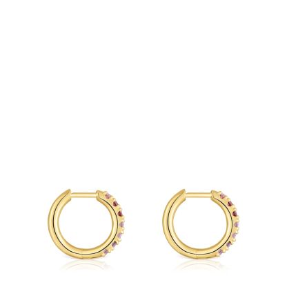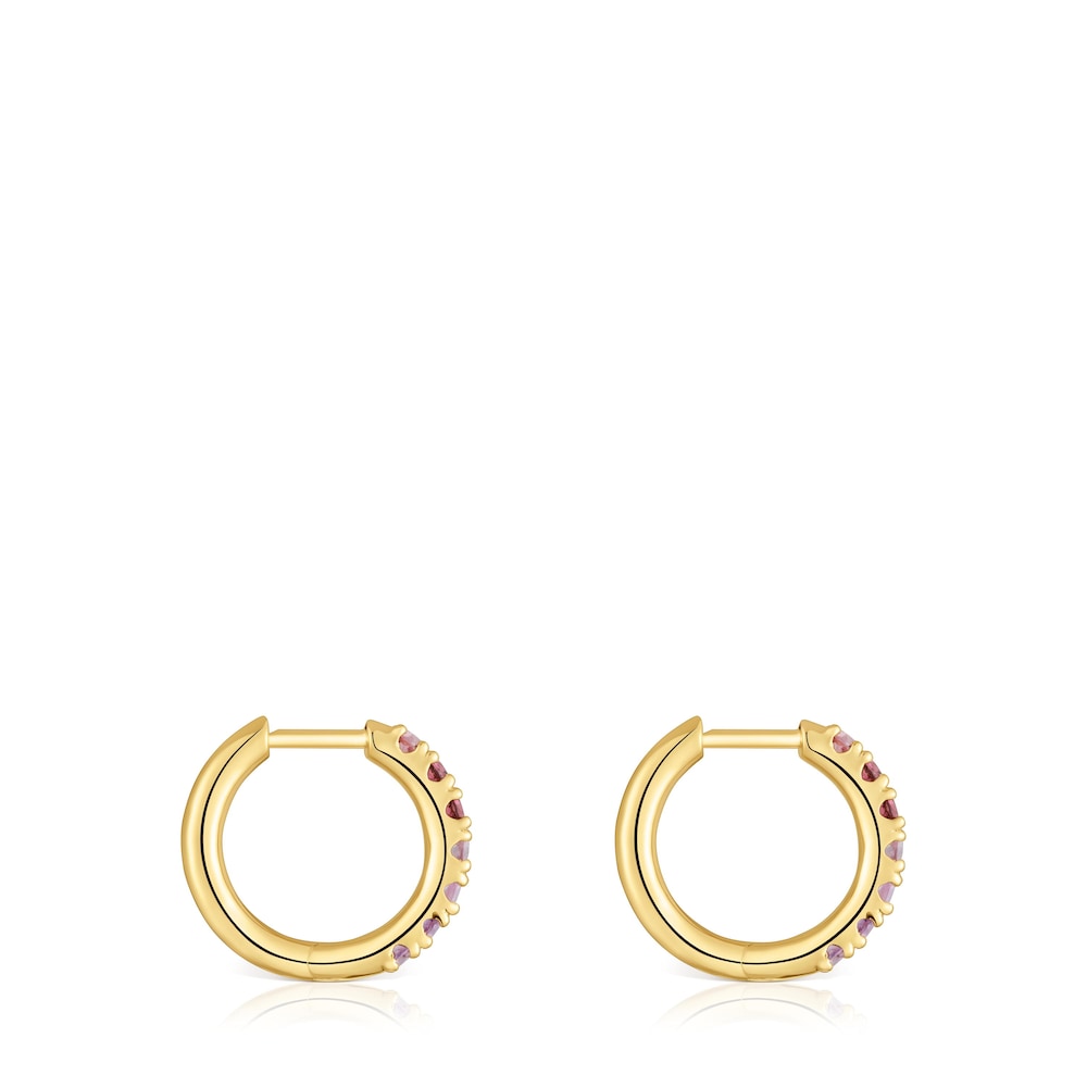 Pendientes de aro TOUS Straight con baño de oro 18 kt sobre plata y gemas redondas facetadas. Gemas: rodolita y amatista. Tamaño pendientes: 14 mm. Pieza fabricada con plata de primera ley con baño de oro de 18 a 23 kt y 3 micras de espesor. Esta calidad garantiza una mayor durabilidad de la joya.
