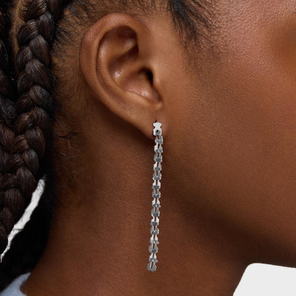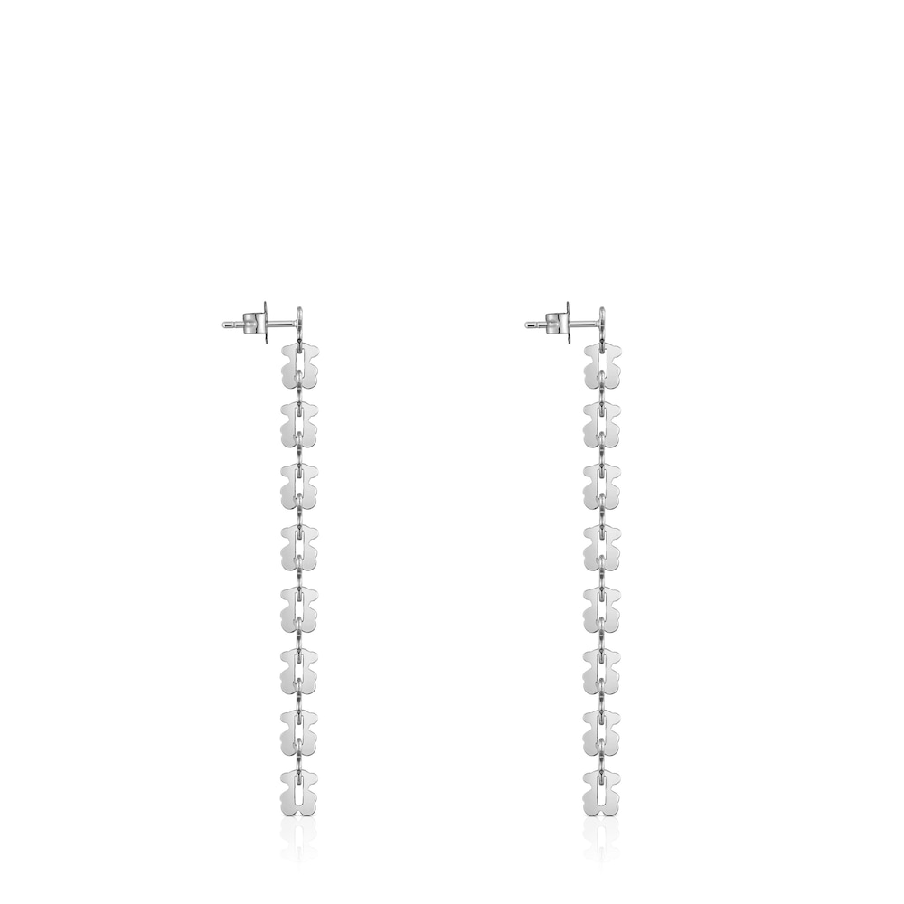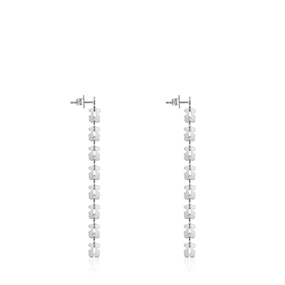 Pendientes largos TOUS Carrusel en acero inoxidable y motivos oso entrelazados. Longitud pendientes: 65 mm. Grosor: 5,6 mm. Cierre presión.
