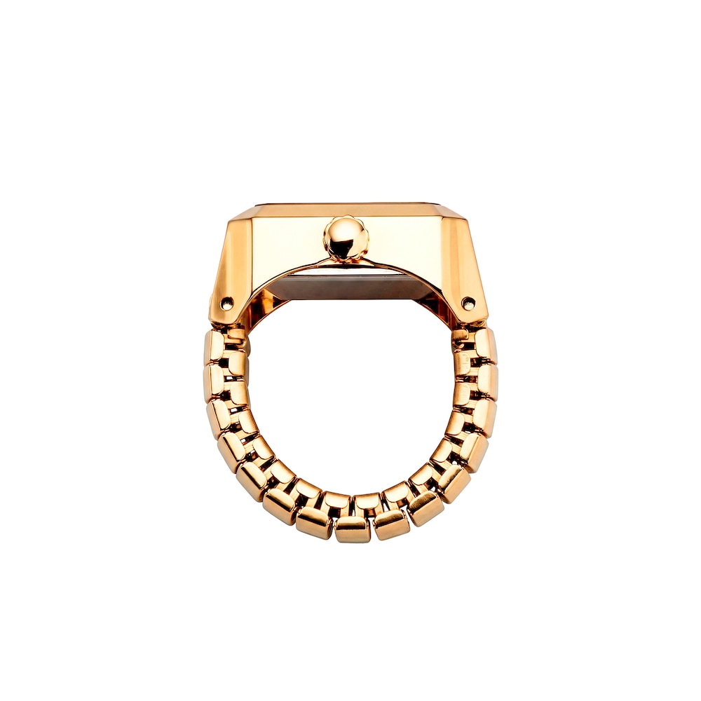 Anillo/Reloj analógico en acero inoxidable en color dorado. Dimensiones: 18 mm x 16 mm. Cristal mineral plano rectangular. Esfera de metal. Impermeable a 3 ATM. Movimiento de cuarzo japonés. Batería de óxido de plata SR521SW de 1,55 V / 0,2 gramos. Funciones: hora y minutos. Aro estirable en acero inxodable. Medidas: 12h/6h: 14 eslabones: 40,2 mm / 15 eslabones: 42,9 mm / 16 eslabones: 45,6 mm. Sin cierre.