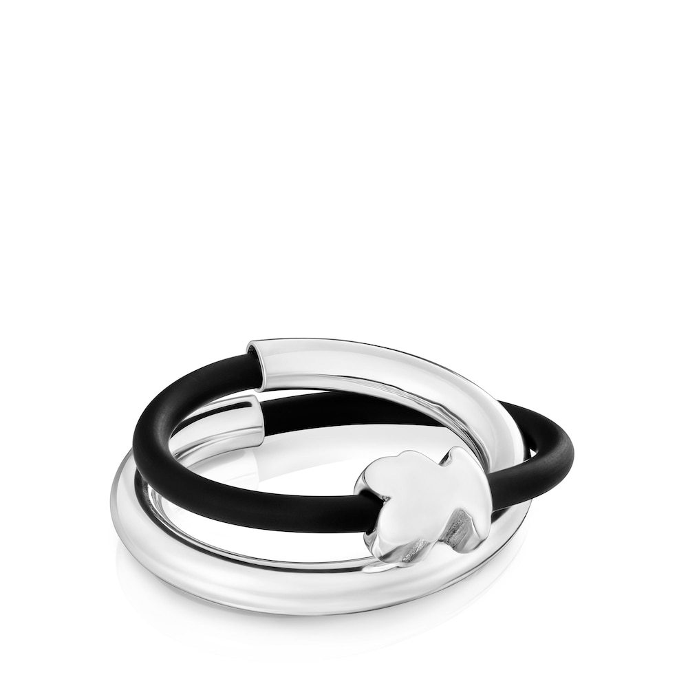 Anillo doble TOUS Bold Motif con motivo oso de plata de primera ley y caucho negro. Tamaño motivo: 7 mm.